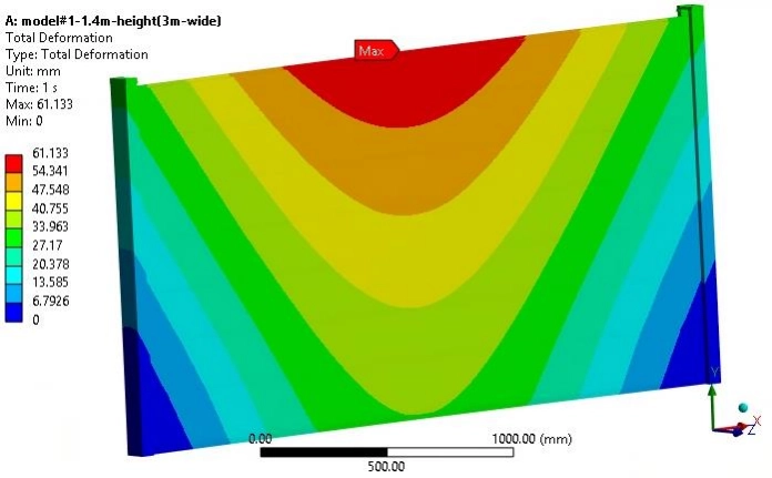This image shows how a flood panel reacts when water pushes against it. The colors go from blue (no bending) to red (most bending). As you can see, the center of the panel – especially near the top – bends the most. This test was done on a 3-meter-wide panel at 1.4 meters high. The red area shows where the panel moves the most under pressure, while the blue edges show where it stays firm because it’s supported.